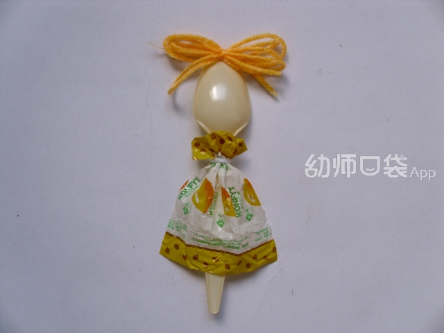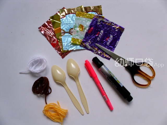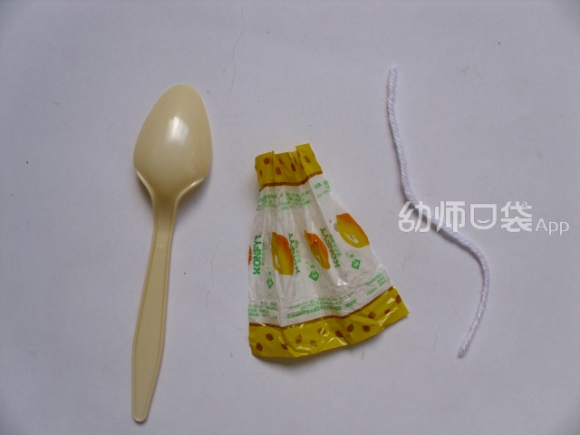 2.将一张糖纸像折小扇子一样折出褶子,中间用毛根系紧。毛根要注意留一条长长的“尾巴”,以便缠在作为身体的勺子上。