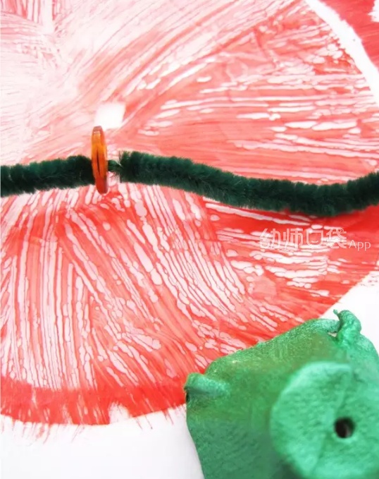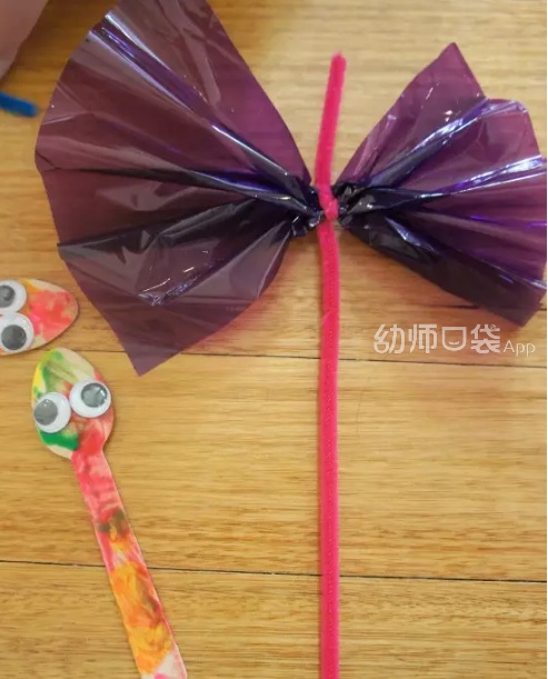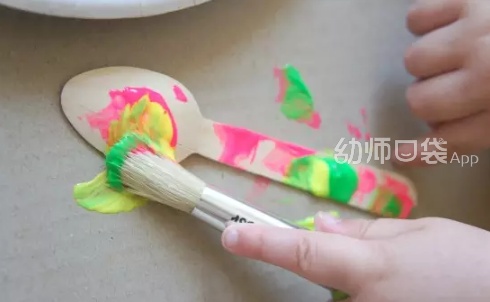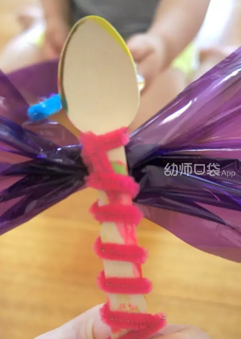 1.让孩子给一只塑料勺子随意涂上五颜六色的颜料,作为蜻蜓的身体。