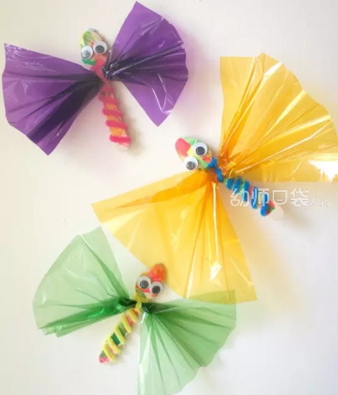 通过折叠糖纸、扭毛根等简单动作就能完成的可爱小蜻蜓,在老师的指导下,幼儿园的小朋友们完全可以胜任。而且糖纸与毛根的搭配色彩鲜艳,毛茸茸,亮闪闪,孩子们绝对会喜欢!
