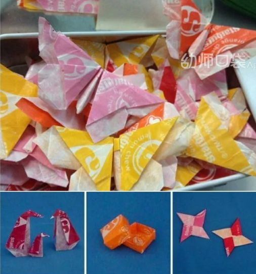 虽说折纸是基本玩法,但是糖纸做出来的跟彩纸不一样,不仅颜色鲜艳,凑近一闻,咦?还带着糖果的香甜呢!