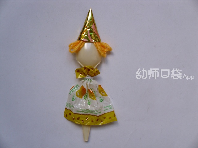 3.戴一顶帽子:把糖果纸绑在脖子的位置,下摆散开,头发用毛线绕几圈,用酒精胶或者透明胶固定。