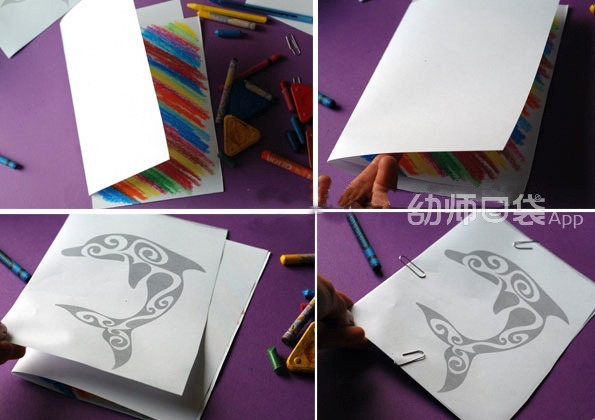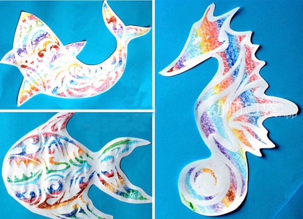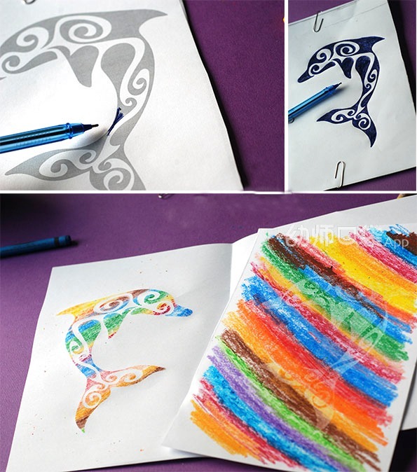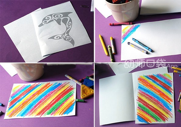步骤:1、白色手工纸上用油画棒涂满各种颜色,尽量将颜色涂的深一些。
