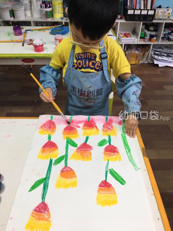 步骤:1、在一张大的手工纸上画好鸡冠花。然后用水粉调的稀一些,用毛笔涂抹在画上,涂抹的时候记得不要碰到油画棒的地方,防止混色。